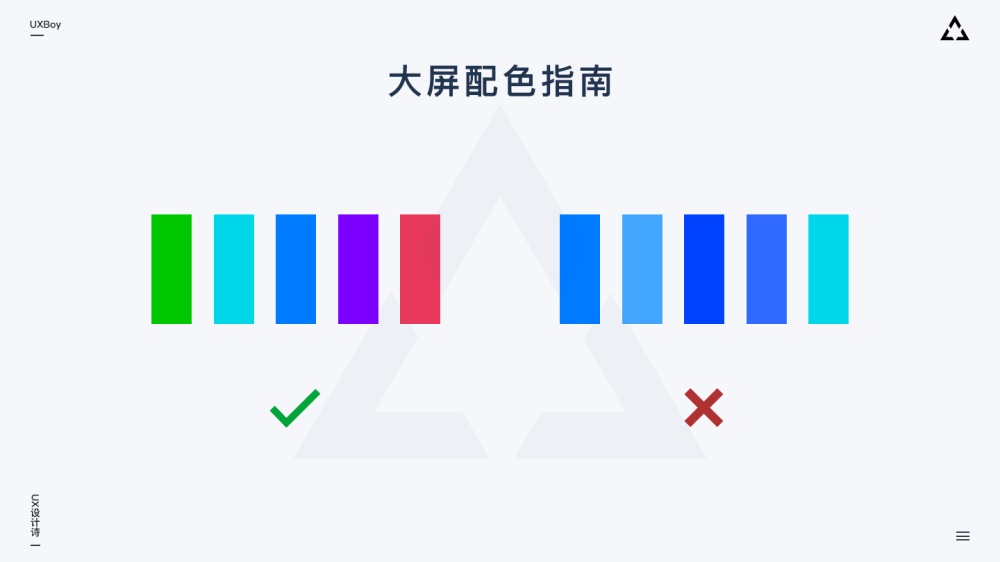 大屏的分辨率、比例、使用環(huán)境、投射方式等均會對設(shè)計造成影響。理想情況下,我們應(yīng)該在設(shè)計開始前,就能打開大屏系統(tǒng)做一些簡單測試。我們可以從網(wǎng)上收集不同設(shè)計師不同風(fēng)格的大屏設(shè)計作品,然后投上去查看實(shí)際效果。因?yàn)榇蠖鄶?shù)時候大屏都會存在色彩偏差,這時通過測試我們就能發(fā)現(xiàn)漸變色、鄰近色等不同類型的色彩搭配是否可以在目標(biāo)大屏上良好呈現(xiàn),如果不可以,那我們設(shè)計進(jìn)行時就不要使用顯示效果不佳的色彩搭配。另一方面,樣圖溝通環(huán)節(jié)及時測試也很重要。