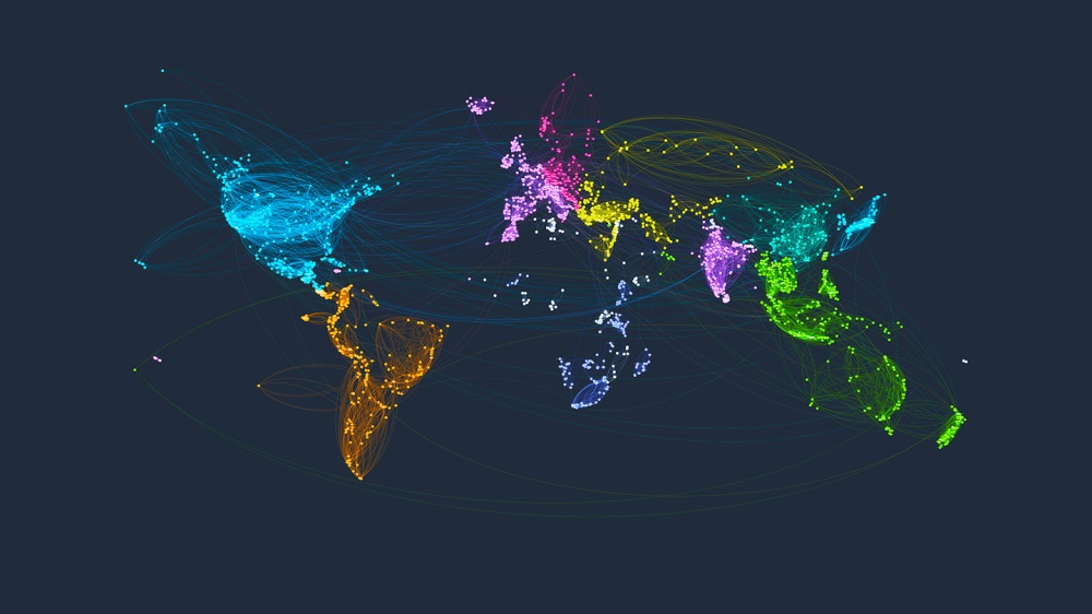 國家之間相互連通的旅游路線,顏色越相近的國家,表明兩個國家的人們互動越頻繁。