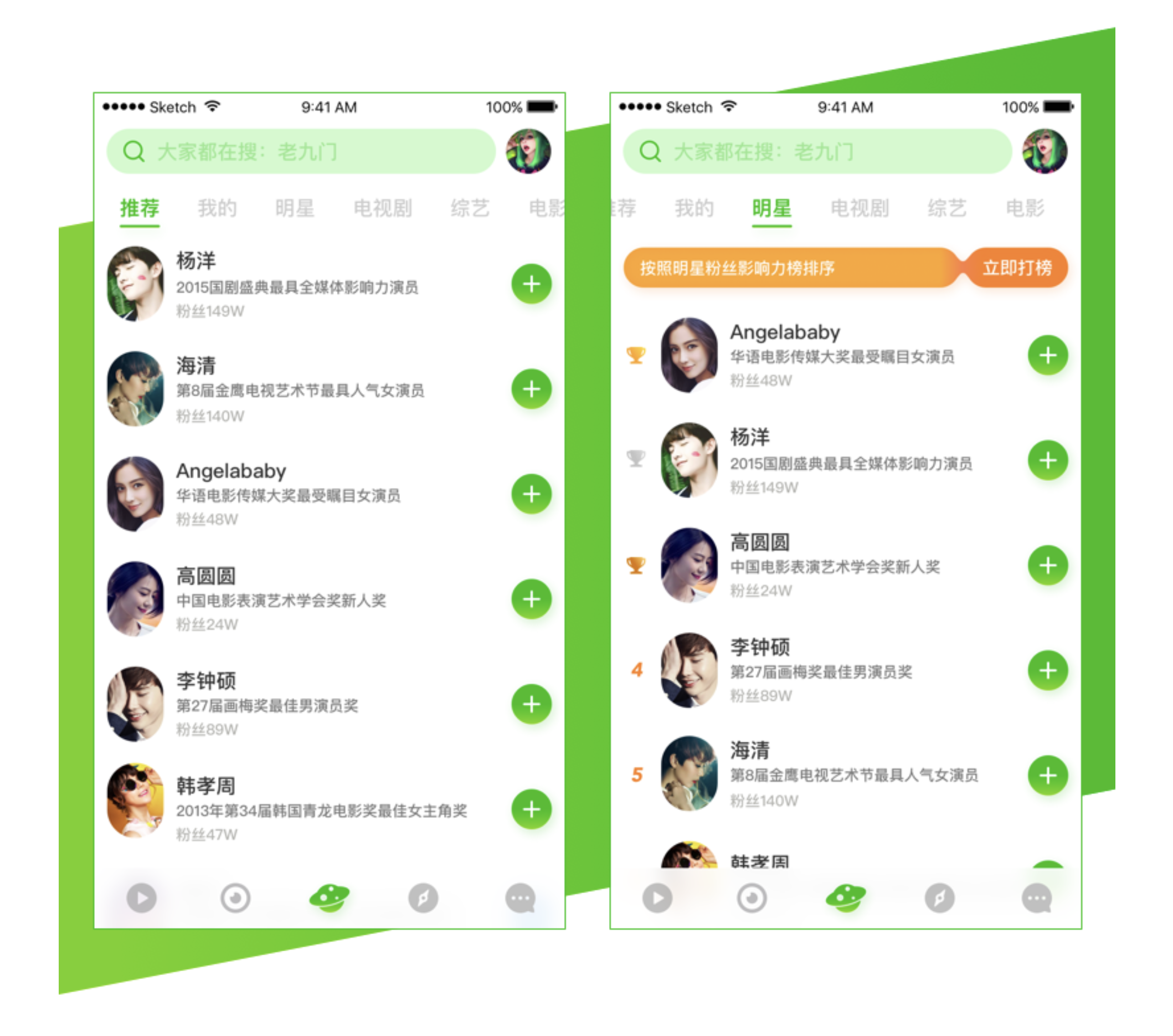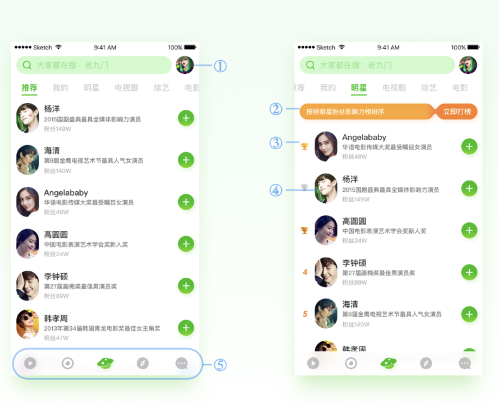 - 信息展示:明星圈簡介字段保留,布局與推薦頁一致;明星標簽頁將排序信息放列表左側,不外露影響力分值等與排名相關信息,營造榜單氛圍。