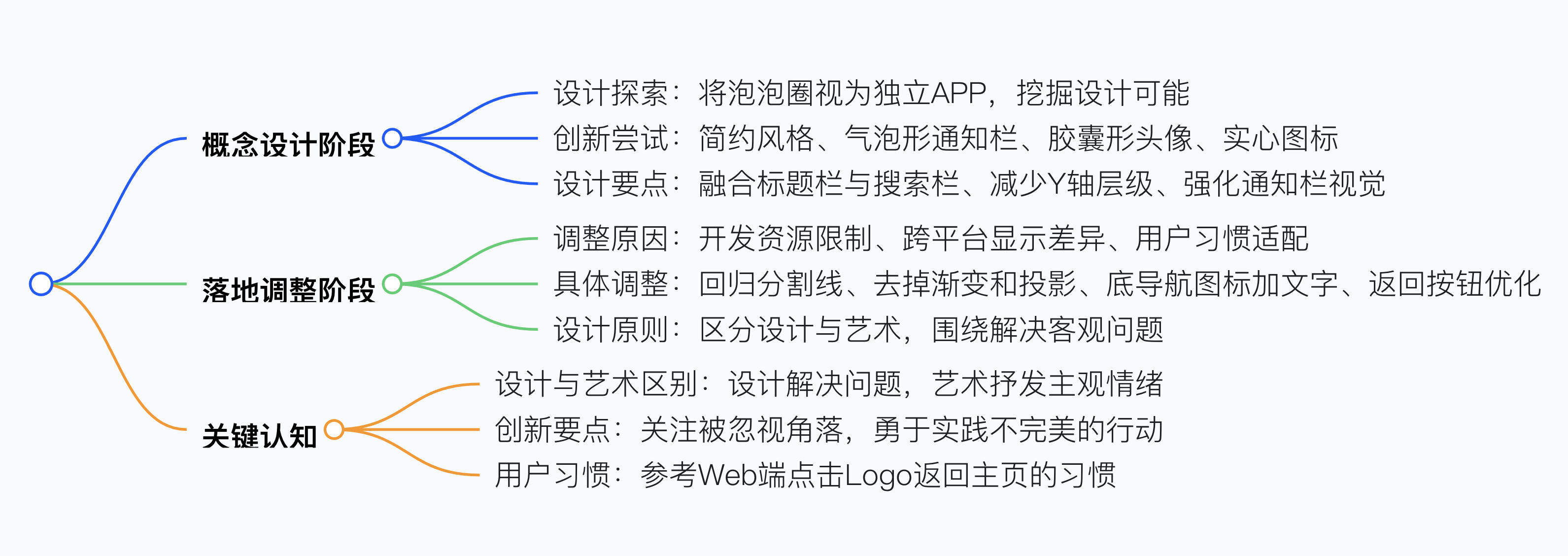 UI 設計思路應先放飛概念探索多種可能,如將泡泡圈視為獨立 APP 進行設計,嘗試簡約風格、氣泡形通知欄、膠囊形頭像、實心圖標等創(chuàng)新設計,再結合實際落實到產(chǎn)品,比如因開發(fā)資源和屏幕顯示限制去掉漸變和彌散投影、回歸分割線和返回按鈕,同時要明確設計與藝術的區(qū)別,設計需圍繞客觀問題解決,概念稿后要提取可用點推動落地,注重用戶習慣和跨平臺適配,像用愛奇藝 Logo 代替文字返回按鈕。