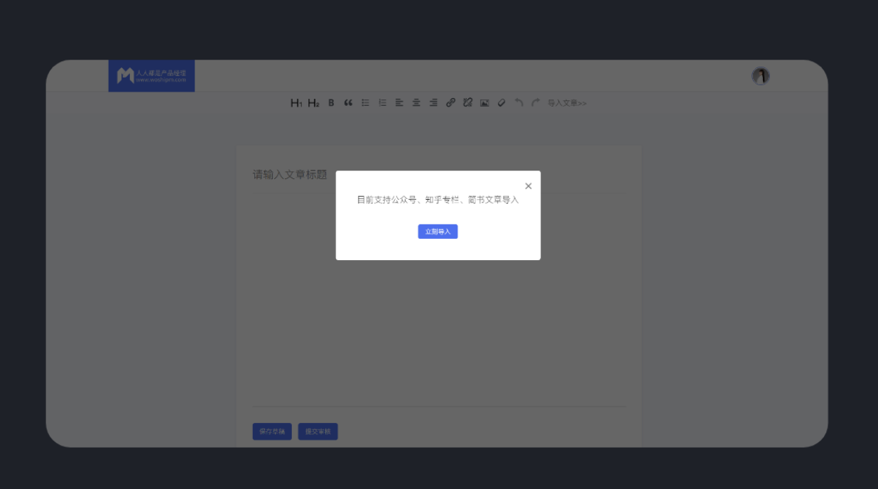 好用的 B 端產(chǎn)品能顯著提升用戶操作效率,讓工作如行云流水般順暢。反之,難用的產(chǎn)品就像用鈍刀切黃油,不僅效率低下,還會讓人心情煩躁。“人人都是產(chǎn)品經(jīng)理” 的文章投稿發(fā)布頁面設(shè)置了文章導(dǎo)入功能,支持從公眾號、簡書、知乎專欄導(dǎo)入文章,大大節(jié)省了投稿人編輯文本和排版的時(shí)間,減少了重復(fù)排版的麻煩,也提高了人們的投稿意愿。