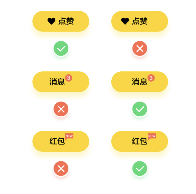 在設(shè)計(jì)一個(gè)按鈕時(shí),經(jīng)常會(huì)在旁邊增加一個(gè)圖標(biāo) / 元素,原本垂直水平居中對(duì)齊的文字,因增加圖標(biāo)后不得不作調(diào)整,將其群組并水平居中對(duì)齊。但也有例外,增加的元素不是固定元素,比如新消息提醒、新功能提示,我們將其稱為懸浮元素。
