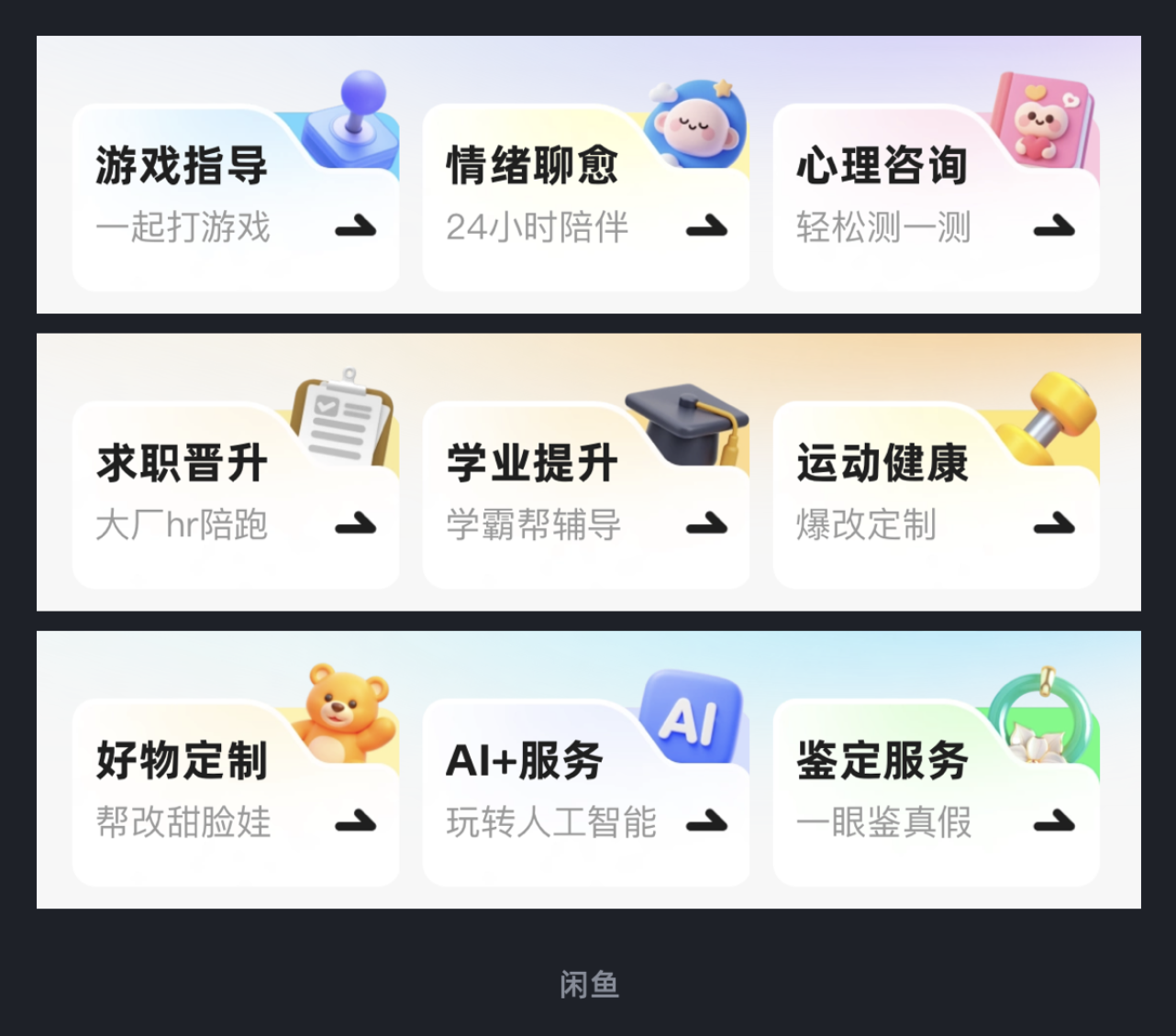 閑魚的副業(yè)模塊(如游戲指導(dǎo)、情緒聊愈、心理咨詢)采用 “異形卡片” 設(shè)計(jì):每張卡片的右上角都做了凹陷處理,將功能圖標(biāo)嵌入凹陷處,形成 “卡片 - 圖標(biāo)” 的第一層關(guān)聯(lián);同時(shí),每張異形卡片下方又疊加了一層淺色調(diào)的背景卡片,通過色彩深淺和輪廓差異,形成 “背景卡片 - 異形卡片 - 圖標(biāo)” 的三層結(jié)構(gòu)。這種設(shè)計(jì)不僅讓每個(gè)副業(yè)模塊的邊界更清晰,還通過 Z 軸層級(jí)的差異,避免了多模塊排列的呆板感,用戶能快速識(shí)別不同功能。