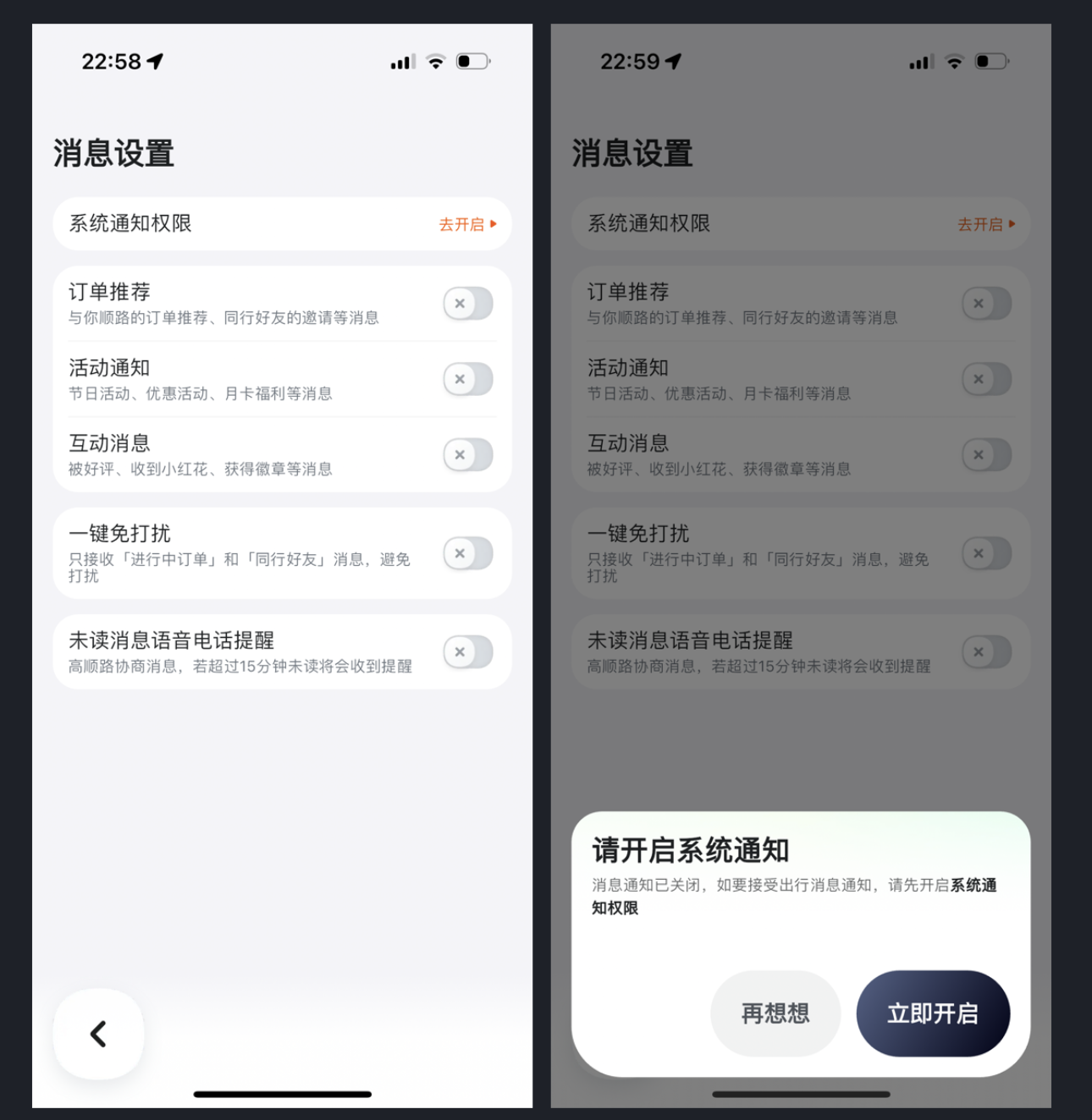嘀嗒的通知設(shè)置頁面,沒有強(qiáng)制用戶開啟所有通知,而是提供了 “一鍵免打擾” 功能 —— 用戶開啟后,僅接收 “進(jìn)行中訂單”“同行好友” 等重要消息,過濾掉活動(dòng)推廣、優(yōu)惠通知等非必要信息。同時(shí),頁面清晰區(qū)分了通知類型(訂單推薦、活動(dòng)通知、互動(dòng)消息),讓用戶可自主選擇。這種設(shè)計(jì)不是 “逼用戶開啟”,而是 “幫用戶篩選”,站在用戶視角解決 “怕打擾” 的痛點(diǎn),反而提升了用戶開啟通知的意愿。