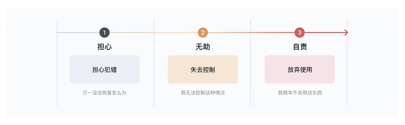 而不管是哪種錯誤,都會觸發(fā)用戶的負(fù)面情緒:擔(dān)心 “刪錯的文件找不回來”(恐懼)、覺得 “我怎么連這個都不會用”(自責(zé))、面對錯誤提示不知道下一步該做(無助)。最可怕的是 “自責(zé)”—— 當(dāng)用戶把錯誤歸咎于自己,壓力會越來越大,最后干脆關(guān)掉 APP,再也不回來。