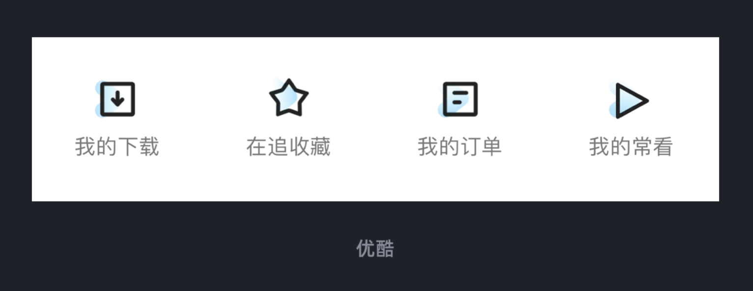 比如優(yōu)酷個人中心的圖標 ——“我的下載”“我的訂單” 這些功能按鈕,都采用簡潔的線性風格,但在圖標的底層悄悄疊加了優(yōu)酷的品牌圖形元素。這種 “線性 + 品牌點綴” 的設計,既保持了界面的清爽感,又讓圖標跳出了 “千篇一律” 的困境,用戶看到圖標時,會下意識聯(lián)想到 “這是優(yōu)酷的設計”,慢慢形成記憶點。