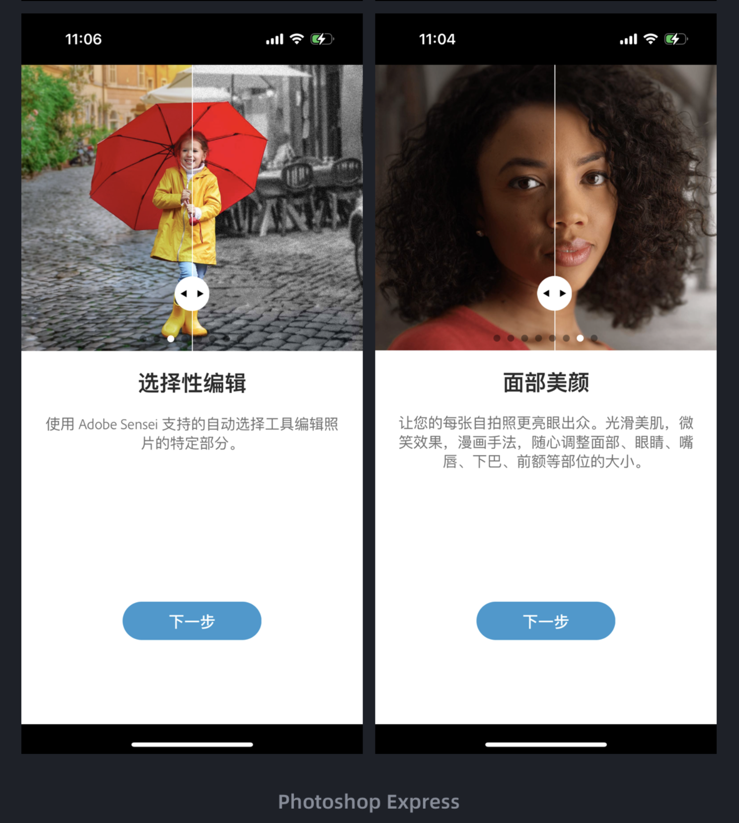 很多產品的引導頁、功能介紹,都喜歡用 “靜態(tài)圖文”,用戶看了容易忘,也感受不到功能的實際價值。但 Photoshop Express 的引導頁設計,卻用 “互動” 讓功能優(yōu)勢變得直觀 —— 用戶不用 “看說明”,而是 “親身體驗”。