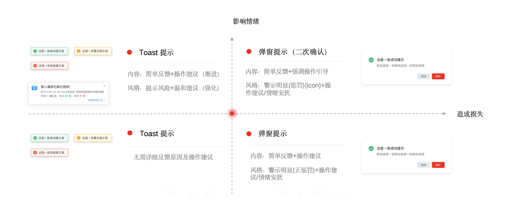 - 力度適當:根據(jù)風險等級調(diào)整語氣,預判用戶可能面臨的損失或情緒變化。比如普通操作失敗,不用過于否定,“當前已是第一輪,操作失敗!” 改為 “當前為第一輪審批,暫無法執(zhí)行該操作” 更溫和;涉及數(shù)據(jù)安全的重要提示,語氣可稍重但不命令,“現(xiàn)在關(guān)閉您的信息可能會丟失” 比 “關(guān)閉就丟數(shù)據(jù)” 更易接受。