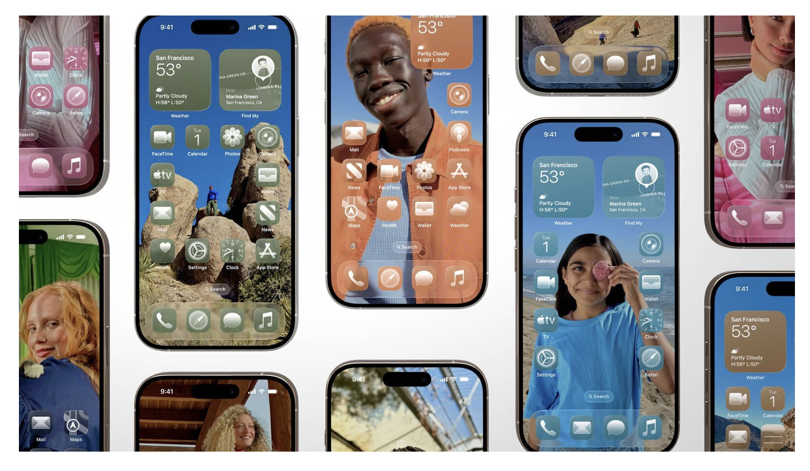 細節(jié)方面,動態(tài)島、通知中心、長按手勢和應用程序庫保留原有實用功能,僅在視覺上融入玻璃美學 —— 應用程序庫文件夾半透明化,搜索欄改為圓形設計;時鐘支持自適應調整大小,搭配照片壁紙時可自動擴展填充空間,甚至能與圖像獨特重疊,打破傳統(tǒng)時鐘的顯示局限。