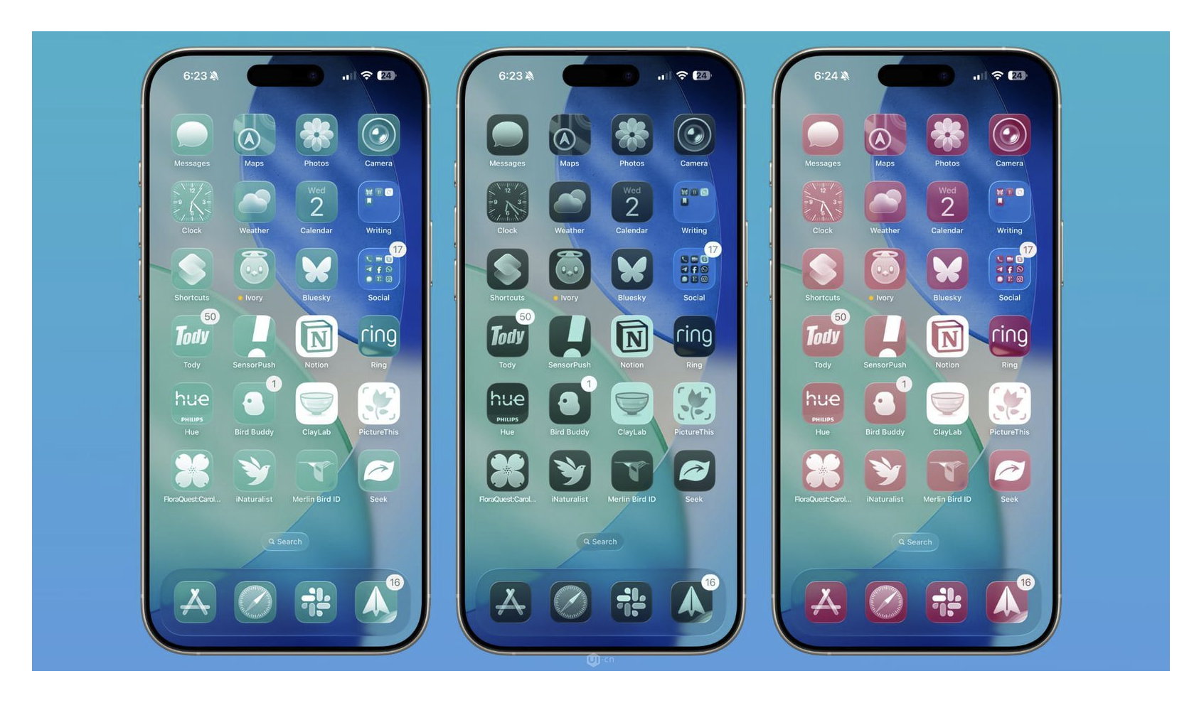 圖標系統(tǒng)迎來重大升級,除了默認、深色、有色三種樣式,新增的 "清除圖標" 堪稱點睛之筆。這種圖標完全透明,直接借用壁紙顏色,僅以上方的白色圖形標識功能,搭配 "淺色(磨砂玻璃質感)" 和 "深色(有色玻璃質感)" 兩種選項,讓桌面風格既能極簡純粹,又能與壁紙形成巧妙呼應。