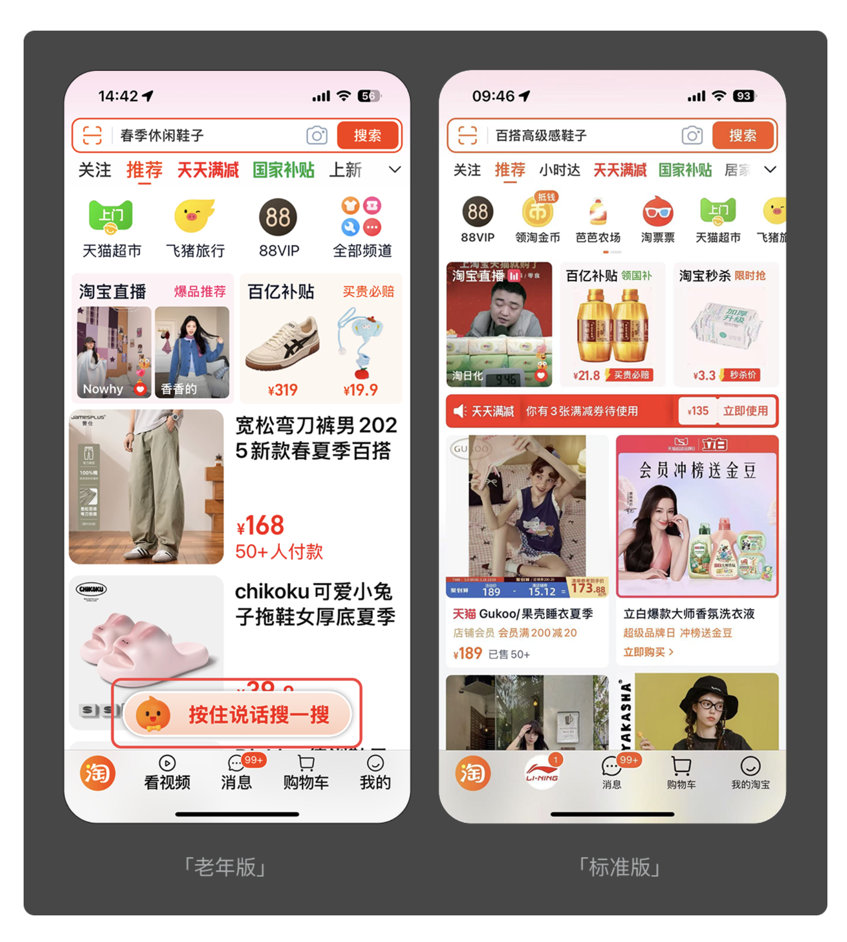 打字對于許多老人而言是一大難題 —— 視力模糊導(dǎo)致按鍵不準(zhǔn)、拼音基礎(chǔ)薄弱難以拼寫,這些都讓文字輸入成為數(shù)字使用的 “攔路虎”。語音操作的引入,恰好解決了這一痛點。淘寶老年版在底部導(dǎo)航欄設(shè)置了顯眼的 “按住說話搜一搜” 按鈕,老人只需說出商品名稱,即可完成搜索,無需手動輸入;中國工商銀行老年版也加入了 “語音操作” 功能,查詢賬戶余額、辦理生活繳費、購買理財產(chǎn)品等操作,都能通過語音指令完成,極大簡化了操作流程。語音交互以更自然的方式搭建起老人與產(chǎn)品的溝通橋梁,讓操作門檻大幅降低。