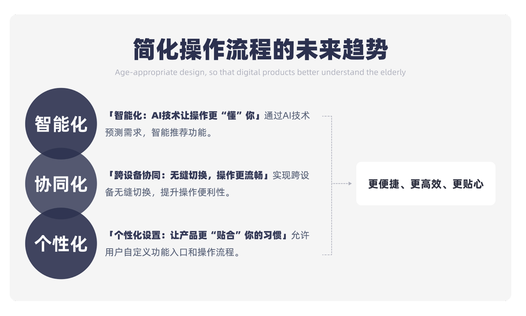 當(dāng)下,適老化設(shè)計已不再是 “錦上添花” 的加分項,而是數(shù)字產(chǎn)品必須承擔(dān)的社會責(zé)任。隨著 AI 技術(shù)的發(fā)展,未來的適老化設(shè)計還將朝著智能化、協(xié)同化、個性化方向邁進 —— 通過 AI 預(yù)測老人需求,智能推薦常用功能;實現(xiàn)跨設(shè)備無縫切換,讓操作更流暢;允許用戶自定義功能入口,讓產(chǎn)品更貼合個人習(xí)慣。