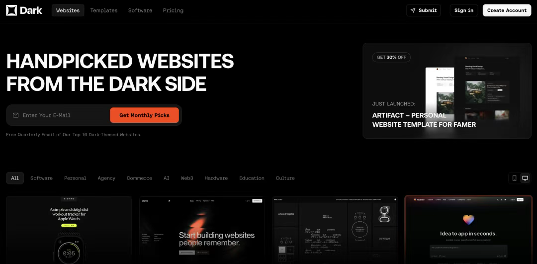 [Dark Design](http://dark.design) 專(zhuān)注于收集優(yōu)秀的暗色模式網(wǎng)站設(shè)計(jì)。隨著暗色模式在各種平臺(tái)上的普及,這個(gè)資源變得越來(lái)越有價(jià)值。