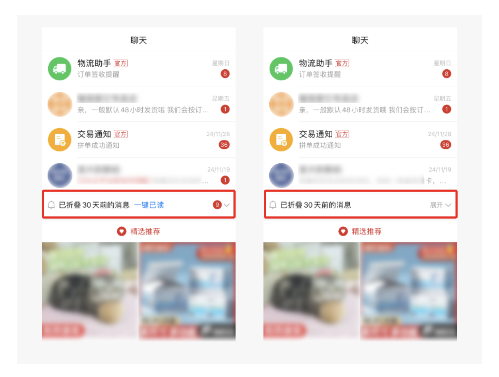 • 消費(fèi)相關(guān)消息(客服對話、系統(tǒng)通知)單獨(dú)設(shè)置 **「全部已讀」** 按鈕,置于各分類的頂部,支持精準(zhǔn)清理;