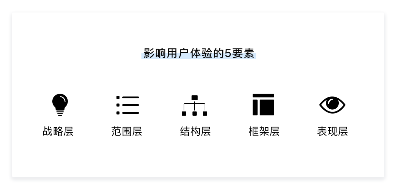 無論 UX 設(shè)計的形式如何變化,其核心框架始終圍繞《用戶體驗要素》提出的戰(zhàn)略層、范圍層、結(jié)構(gòu)層、框架層、表現(xiàn)層五個層級展開。這五個層級從抽象到具體、從概念到落地,構(gòu)成了 UX 設(shè)計的完整邏輯體系,既是分析產(chǎn)品的工具,也是從 0 到 1 打造產(chǎn)品的核心方法論。
