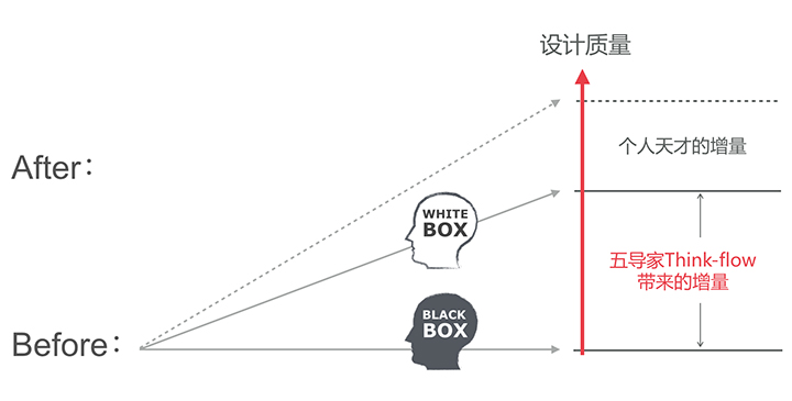 業(yè)務(wù)協(xié)同其實(shí)大家都不難理解,所有UED都在做這樣的事情,保質(zhì)保量的完成業(yè)務(wù)需求,不斷迭代產(chǎn)品進(jìn)度;設(shè)計(jì)增值就有一些難度了,首先要搞清楚如何論證設(shè)計(jì)的價(jià)值,才能說(shuō)出增值有多少,所以針對(duì)這個(gè)問(wèn)題我們打造了頁(yè)面數(shù)據(jù)統(tǒng)計(jì)工具,方便設(shè)計(jì)師、開(kāi)發(fā)、運(yùn)營(yíng)、PD低成本的查看頁(yè)面上線(xiàn)后的數(shù)據(jù)反饋,及時(shí)了解設(shè)計(jì)的結(jié)果。設(shè)計(jì)師要做到增值,我們會(huì)推行《五導(dǎo)家》,常規(guī)來(lái)說(shuō),設(shè)計(jì)師一般接到設(shè)計(jì)需求就進(jìn)入設(shè)計(jì)執(zhí)行階段,中間思考過(guò)程是黑盒,即每次的設(shè)計(jì)都是發(fā)揮不同設(shè)計(jì)師個(gè)體價(jià)值,專(zhuān)業(yè)強(qiáng)的設(shè)計(jì)師輸出作品好一些,普通設(shè)計(jì)師輸出結(jié)果不穩(wěn)定,UED團(tuán)隊(duì)整體輸出品質(zhì)不可預(yù)測(cè),而《五導(dǎo)家》方法就是把設(shè)計(jì)過(guò)程的黑盒變成白盒的過(guò)程,是設(shè)計(jì)師常用方法抽象的5步過(guò)程,是設(shè)計(jì)工作的ThinkFlow。