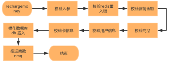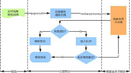 用戶提交訂單并且錢包處理完成后,錢包回調(diào)交易模塊的payresult接口,交易模塊驗證通過之后,會調(diào)用商家會員卡的rechargemoney接口給商家會員卡充值。為了提高充值接口的可用性,與交易模塊有個約定了一個機制:若調(diào)用rechargemoney返回的errno不為0 ,則投入nmq重試三分鐘,三分鐘之內(nèi)的重試均沒有成功,才觸發(fā)自動退款。商家會員卡模塊的充值接口rechargemoney的流程圖如下圖所示: