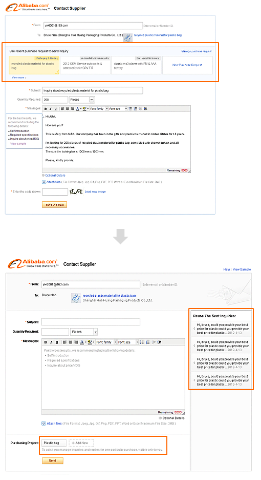下面左圖框出部分是增加的功能,希望買(mǎi)家在發(fā)詢盤(pán)給供應(yīng)商時(shí)能對(duì)當(dāng)前的采購(gòu)需求建組并復(fù)用上次的內(nèi)容,在內(nèi)部討論時(shí),大家都覺(jué)得要強(qiáng)化該選項(xiàng),讓它成為其他內(nèi)容的統(tǒng)領(lǐng),然而調(diào)研的結(jié)果卻大相徑庭,用戶無(wú)法理解這塊內(nèi)容或干脆以為是貼的廣告內(nèi)容而忽略;