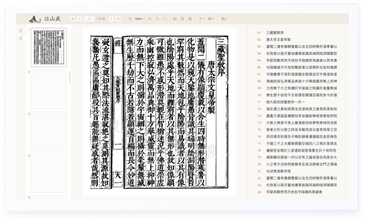 閱讀和操作區(qū)域分開(kāi),所有按鈕置頂集中排布,操作區(qū)盡量簡(jiǎn)化,閱讀時(shí)減少干擾。左側(cè)有目錄和縮略圖切換。